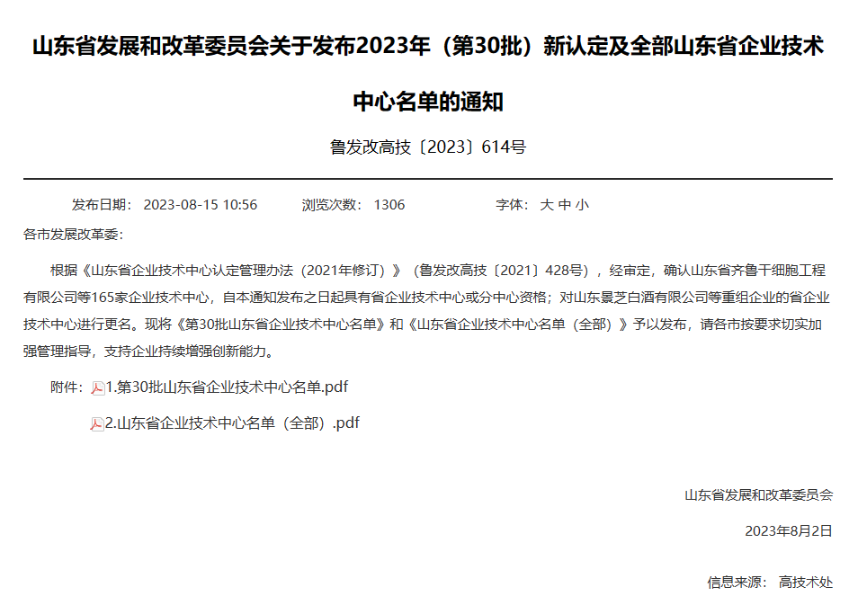 8月15日,山东省发展和改革委员会发布2023年山东省企业技术中心名单,公司凭借自身综合创新能力成功入选,获评山东省企业技术中心称号。