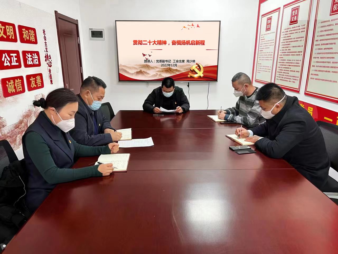 12月29日下午, 公司党委副书记、工会主席周少林以“贯彻二十大精神,奋楫扬帆启新程”为题,为建筑劳务公司党员们讲授专题党课。党课全面深入阐述了“党的二十大召开主题、重大意义、结合工作实际如何落实二十大精神”等三个方面的内容。